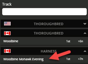 Click ‘Racebook’ from the top menu at the BetOnline website. Open the ‘Canadian Harness’ drop down menu and select ‘Woodbine Mohawk Evening’.
