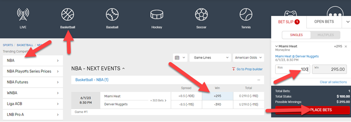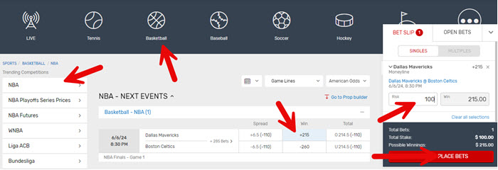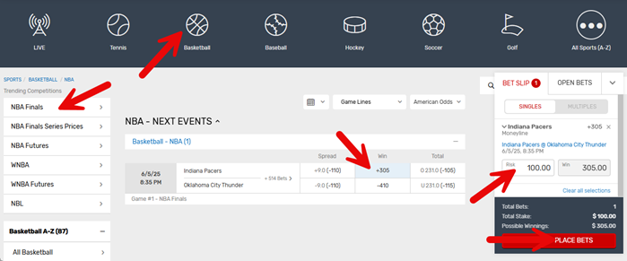 It’s time to place your bets! Click on ‘Sports’ from the top menu bar and select ‘Basketball’ from the secondary sports menu. From here you can select ‘NBA Finals’ to bet on individual games or ‘NBA Playoffs Series Prices’ to bet on the series winner.