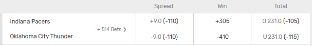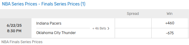 The OKC Thunder are big 5-1 favorites heading into the finals. Shai Gilgeous-Alexander (this years MVP) is playing great basketball and the depth and defense of the team has been on display all playoffs.