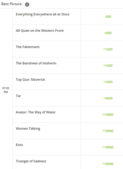 BetOnline will have betting markets for all 23 awards categories. I expect them to add prop betting markets for the Oscars Award Show broadcast on ABC closer to the ceremony.