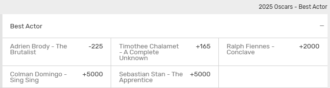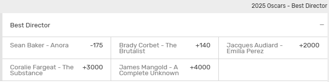 Another category that seems to be undecided according to the odds is the Best Director award. Sean Baker (Anora) is a a slight favorite, but Brady Corbet (The Brutalist) is also right there with similar odds. It would be a surprise if one of these directors did not earn the victory on awards night.
