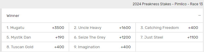 Here is a screenshot of the odds for the race (taken on May 16th – the day before The Preakness):