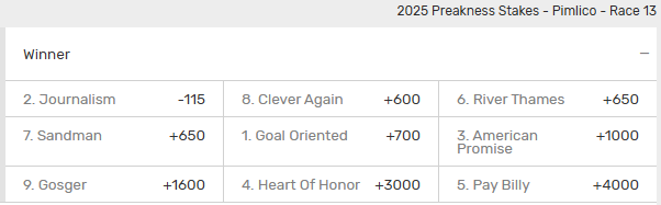 As you can see, Journalism is the favorite with odds of -115, while Clever Again, River Thames, Sandman, and Goal Oriented are the other top contenders.