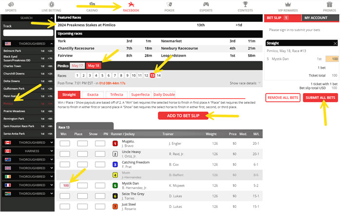 On race day (and a few days before) you will be able to place your wager through the ‘Racebook’ section of the site. Click on ‘Racebook’ from the top navigation bar and then select ‘Thoroughbred’ and ‘Pimlico’ from the left sidebar. Select race #13 (post time of 7:01pm ET) for the Preakness and select the type of wager you’d like to make (win/place/show, exacta, superfecta, etc).