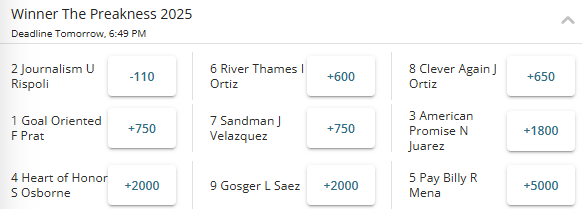 Sovereignty, the Kentucky Derby winner, has chosen to skip the Preakness and focus on the Belmont Stakes in June, which means there will be no chance of a Triple Crown winner this year. That said, the Preakness still has a very strong field with Journalism, who finished second at the Derby, as the morning line favorite with odds of 8/5.