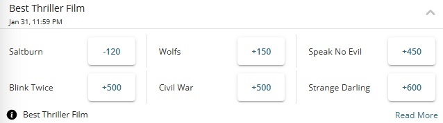 Here is a screenshot of the Best Thriller Film odds to use as an example (odds accurate as of January 22nd):