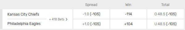 The Chiefs have odds of -114 to win the game. This means every $114 risked on the Chiefs would win $100 if KC wins the game.