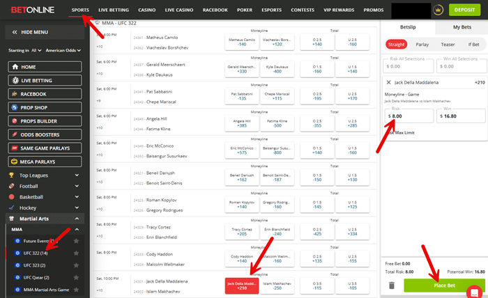 Here’s a screenshot showing you the clicks to bet on Jack Della Maddalena to win his fight.