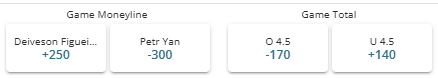 In this example, Islam Makhachev is the favorite with odds of -250. This means you would have to risk $250 betting on Makhachev to win $100 (payout of $350). Della Maddelena has odds of +210 , so a $100 bet on Della Maddelena win $210 (payout of $310).