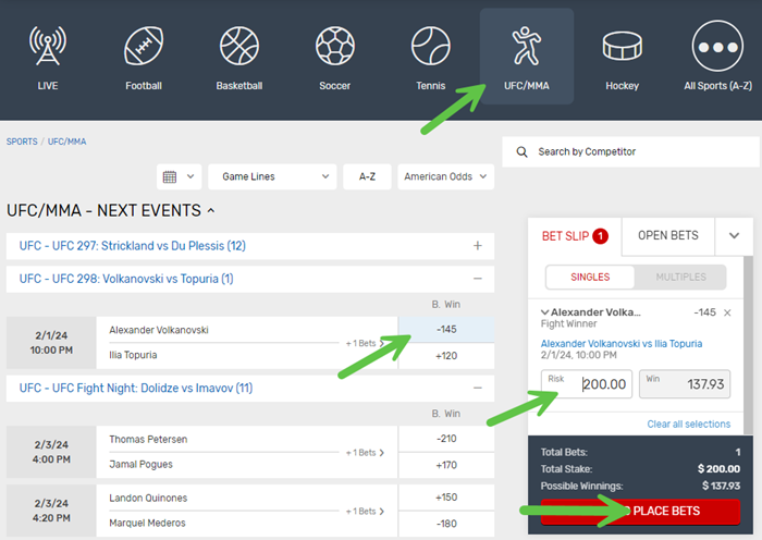 - Click ‘Sports’ from the top menu bar, and ‘UFC/MMA’ from the sports bar.
