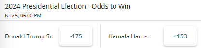 The most popular bet is of course who will win the 2024 US Presidential Election (odds from November 5th, 2024 at 10:39am EST):