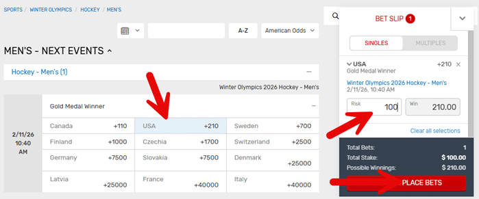 Here’s a screenshot of a bet on Team USA to win the Men’s Hockey gold medal: