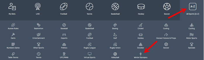 Once on the Bovada website select ‘Sports’ from the top navigation bar, then open the ‘All Sports’ drop down menu and select ‘Winter Olympics’. Here’s a screenshot: