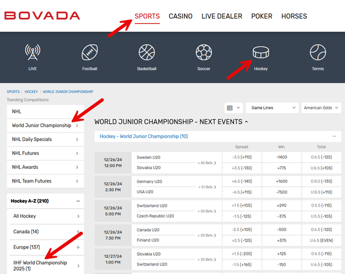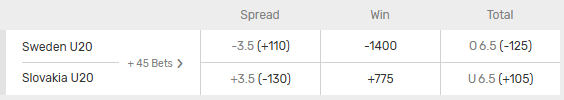 This will bring up all of the upcoming World Junior Championship games. Here’s a screenshot of the odds for the Sweden vs Slovakia game that opens the tournament: