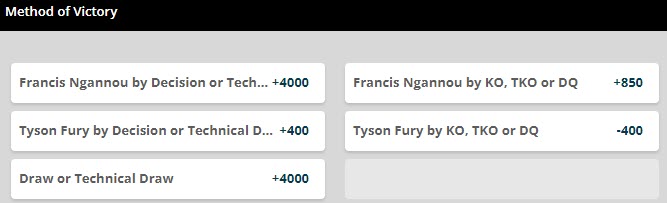 Tyson Fury is a significant favorite with odds of -1500, while Francis Ngannou is the underdog at odds of +800. The odds will change as we approach fight night on Saturday. To see the up to date odds on the BOL website open the ‘Boxing’ drop down menu and select ‘Bouts’.