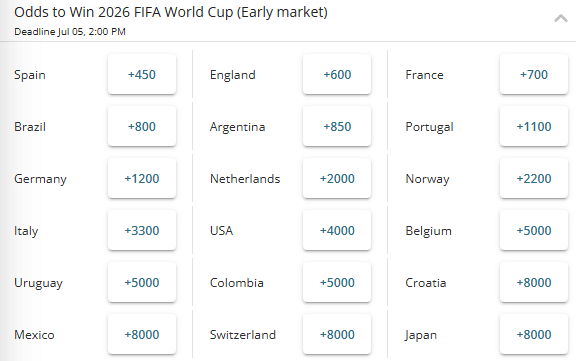 Here are the early odds to win the 2026 FIFA World Cup from BetOnline.ag (odds from November 24th, 2025):