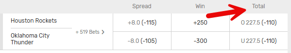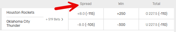 Here’s an example from Houston Rockets season opening game vs the OKC Thunder this season. The -8 for the Thunder indicates that they are 8 point favorites in the game, while the +8 beside Houston indicates they are 8 point underdogs. For a spread bet on the Thunder to win they would have to win the game by 9 or more points. If the Rockets win the game or the Thunder win by 7 or fewer points then the Rockets +8 bet is a winner. If the Thunder win by exactly 8 then the spread bets would push and be returned.