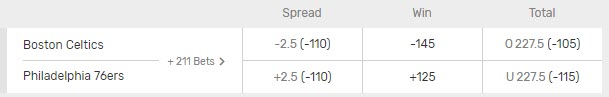In the above example the Magic are -210 favorites. This means every $210 wagered on the Magic would win $100 if the earn the victory. The 76ers are +175 underdogs, which means every $100 risked on the 76ers would win $175 if they won the game.