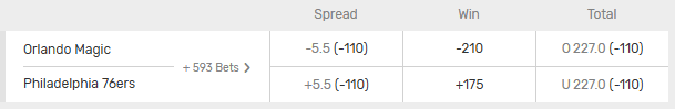 The three most popular betting markets for NBA games are the spread, win (money line), and total. Below I will use an Orlando Magic vs Philadelphia 76ers game from early this season as an example to explain these three popular NBA game wagers.