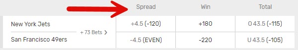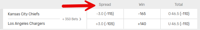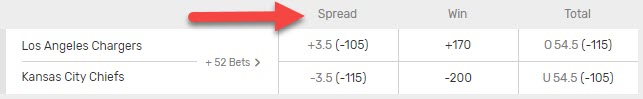 In this example the Chiefs are 3 point favorites (-3). Kansas City must win by 4 or more for a spread bet on the Chiefs to win. The Chargers are 3 point underdogs (+3). LA must win the game or lose by 2 or fewer points to beat the spread. If the Chiefs win by exactly 3 points then the spread bets would “push” and be returned.