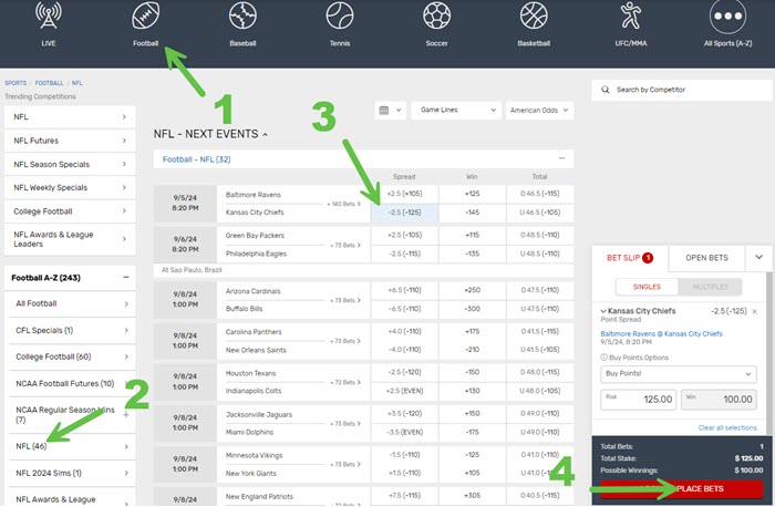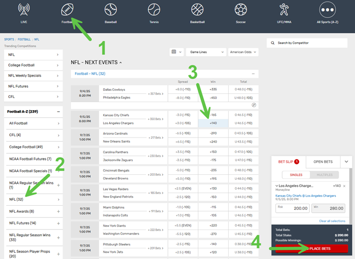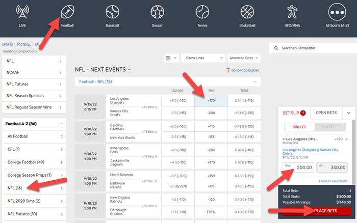 Here’s a screenshot using the Chiefs vs Chargers game as an example to show the clicks to place your bet after you’re on the ‘Sports’ page: