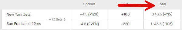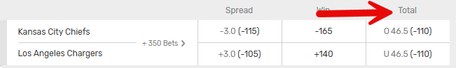 In this example the total is set at 46.5 points. Over bets will win if 47 or more points are scored, while under bets will win if 46 or fewer points are scored.