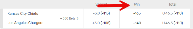 In this example the Chiefs are -165 favorites, which means you would have to risk $165 to win $100 betting on Kansas City. The Chargers are +140 underdogs, so a $100 bet would win $140 betting on LA.