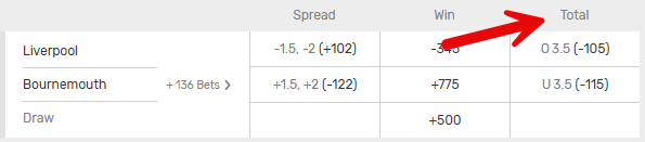 In this example the total is set at 3.5 goals. You can bet the over at -105 and that bet would win if 4 or more goals are scored. If you think it will be a low scoring match you could bet the under at odds of -115. The under bet would win if 3 or fewer goals are scored in the match.