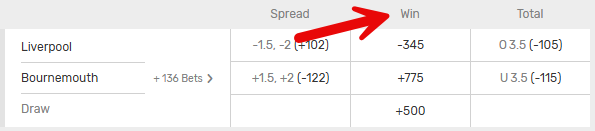 In this example Liverpool is favored to win the match. A $345 bet on Liverpool would win $100 (payout $445). A draw is the second most likely outcome at odds of +500, while Bournemouth has odds of +775 ($100 to win $775) to pull off the upset.