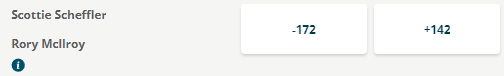 In this example Scottie Scheffler is a -172 favorite to finish the tournament with a better score than Rory. You have to bet $172 on Scheffler to win $100 if he scores better than McIlroy.