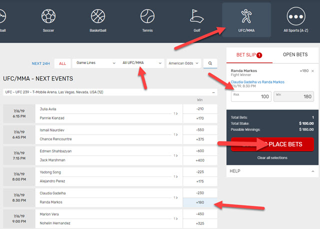 From here you can select the fighter you want to bet on, enter your risk amount in the ‘Bet Slip’ on the right sidebar, and select ‘Place Bets’ to confirm your wagers.